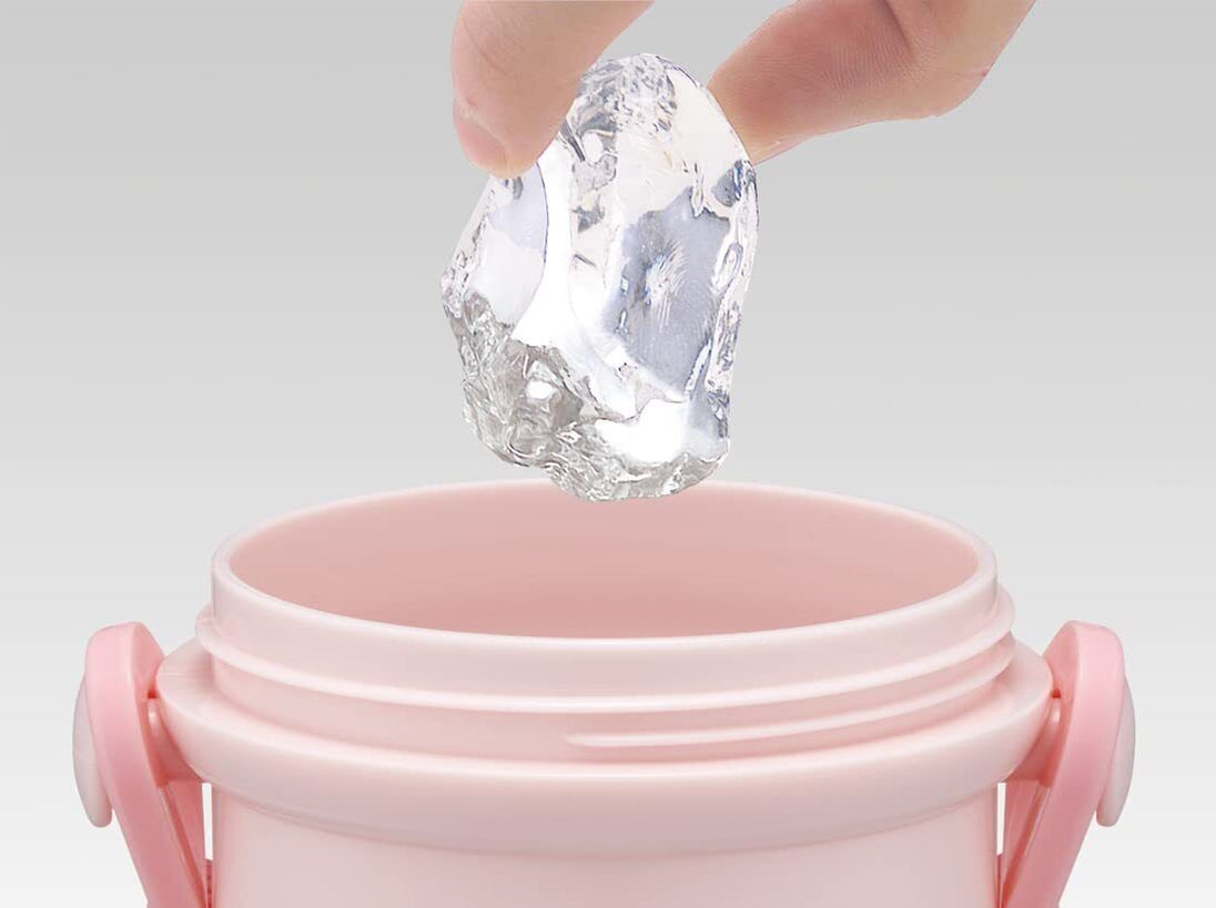 Skater My Melody Drink Bottle. This 480ml bottle features an easy push-button open mechanism and a wide mouth for adding ice cubes effortlessly. Lightweight and designed for convenience, it comes with a shoulder strap for easy carrying and a name label for personalisation.